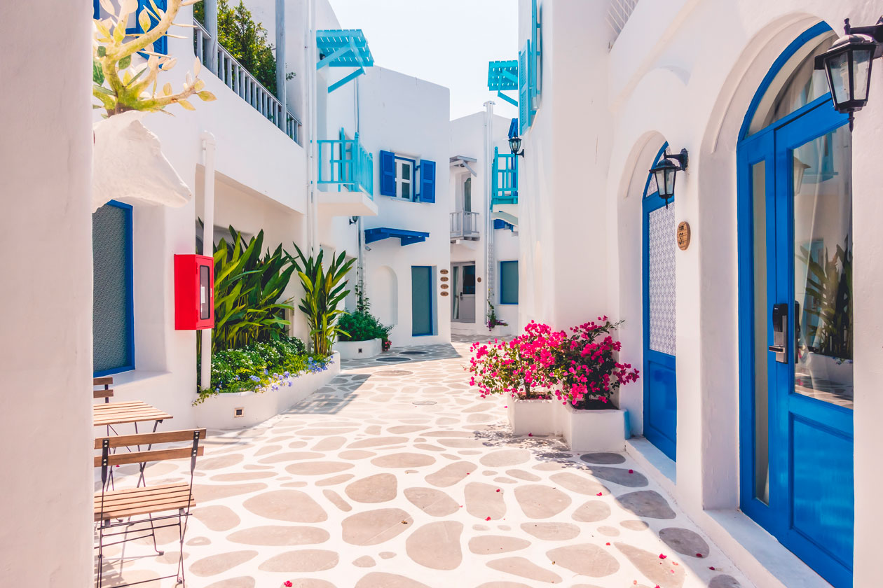 Séjour dans un hôtel de charme ou suite avec vue sur la mer Égée, souvent avec balcon ou terrasse pour admirer les couchers de soleil.